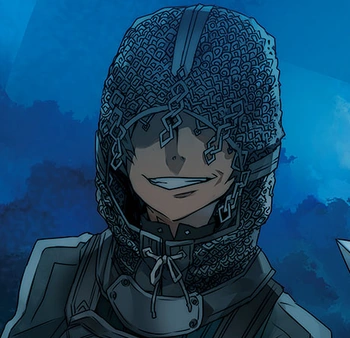 Morte war ein dünner Mann und trug eine dunkelgraue Postschuppe, die nicht metallisch war, sondern eng anliegende Schuppen hatte, die an seinem Oberkörper hingen und nass schimmerten. Er trug auch Handschuhe und Stiefel aus demselben Material und hatte eine Kettenhemdhaube, die von seinem Kopf bis zu seinen Schultern baumelte. Der Rand der Metallhaube war zerrissen und zerlumpt, mit Kettenranken, die wie Haarlocken herabhingen.Morte hatte zwei Waffensätze: Sein Hauptsatz bestand aus einem runden Schild und einer Einhandaxt, genannt Harsh Hatchet; sein zweiter Satz bestand aus einer Glühklinge.