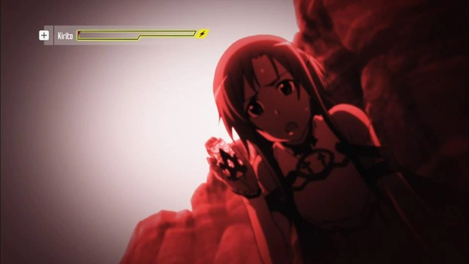 En el episodio 10 cuando Kirito estaba a punto de morir debido a los ataques de Kuradeel, Asuna se apresura en usar un cristal de salud sobre el espadachín.