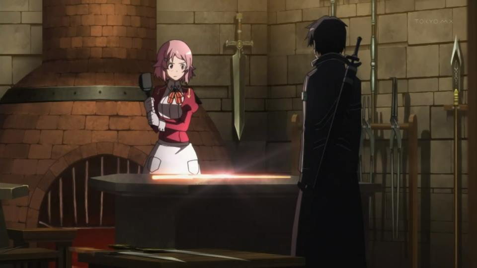 Lisbeth se encontraba ocupada haciendo espadas cuando de pronto oye que un cliente entra en su tienda. El cliente resulta ser Kirito quien ha llegado a pedir una espada hecha a medida. Lisbeth se pregunta si él es capaz de pagar la costoso cuota debido a su aspecto, pero Kirito le asegura que el dinero no es un problema, y pide la mejor espada posible. Cuando Lisbeth le pregunta qué estadísticas debe tener la espada, la respuestas de Kirito es que quiere que sean tan buenas o mejores que su Elucidator. Lisbeth le ofrece la mejor espada que jamás haya recreado. Haciendo caso omiso a las protestas de Lisbeth, Kirito pone a prueba la supuesta mejor arma en contra de su espada negra. Para sorpresa de Lisbeth, la espada que ella ale había entregado se rompe en el choque.