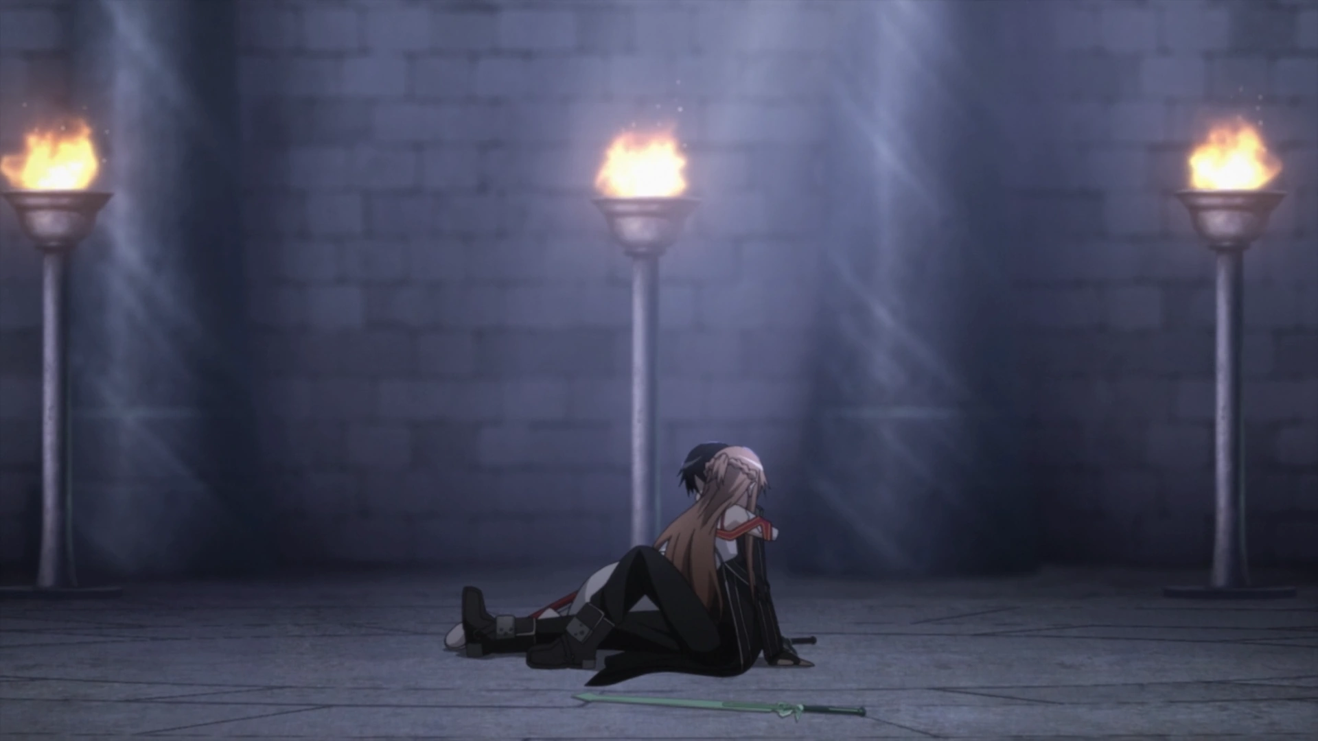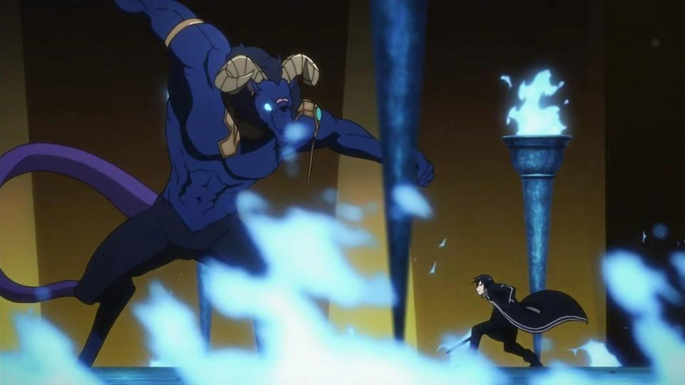 Mientras mantienen los cristales de teletransportación en sus manos, Kirito y Asuna entran en la sala del jefe del piso 74. Cuando las antorchas azules iluminan el interior de la sala, un jefe demonio aparece frente a ellos listo para la batalla, con una gran espada. Su nombre es declarado como The Gleam Eyes.