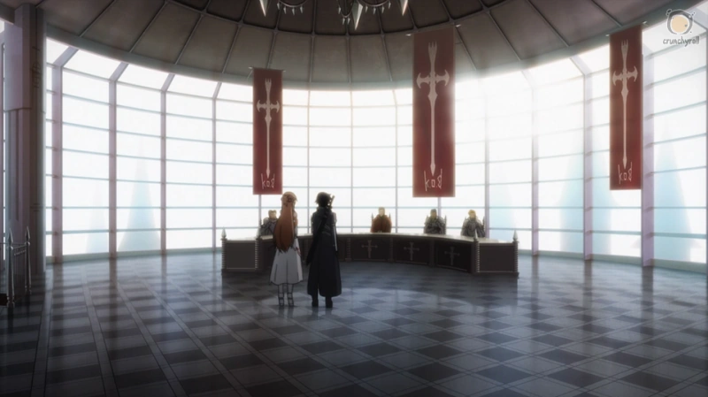Mientras caminan, los protagonistas oyen gritos aterrorizados en la dirección de la sala del jefe. Kirito, junto con Asuna se dan prisa en legar a la habitación. A su llegada, Kirito rápidamente le ordena a los jugadores de El Ejercito teletransportarse, pero para su sorpresa, la sala del jefe es un una zona anticristal por lo que todo tipo de cristales como el de teletransportación son inutilizables. Después de ser testigo de la muerte del comandante, Asuna, Kirito y los demás se apresuran a salvar a los supervivientes restantes.