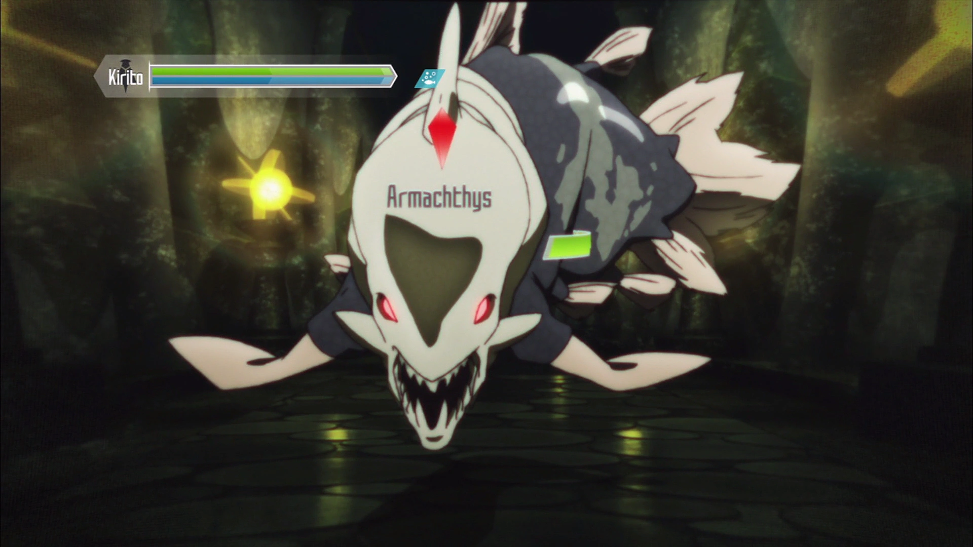 An Armachthys emerged from a trap in the Undersea Temple after Kirito and Klein accidentally fell into it and barely managed to swim out of it. Kirito tried to attract its attention while Klein, Agil, Silica and Lisbeth attacked it from the sides while it was busy and Asuna and Leafa supported the party with magic. However, in the midst of the battle, Leafa decided to join in on the melee, but this caused the Armarchthys to become aggravated at her and respond with its whirlpool ability that sucked in Leafa and made her almost fall into the trap. While the monster was still maintaining its whirlwind, Kirito used its force to reach the ceiling and attack the monster from the top, killing it by hitting the chink in its armour.
