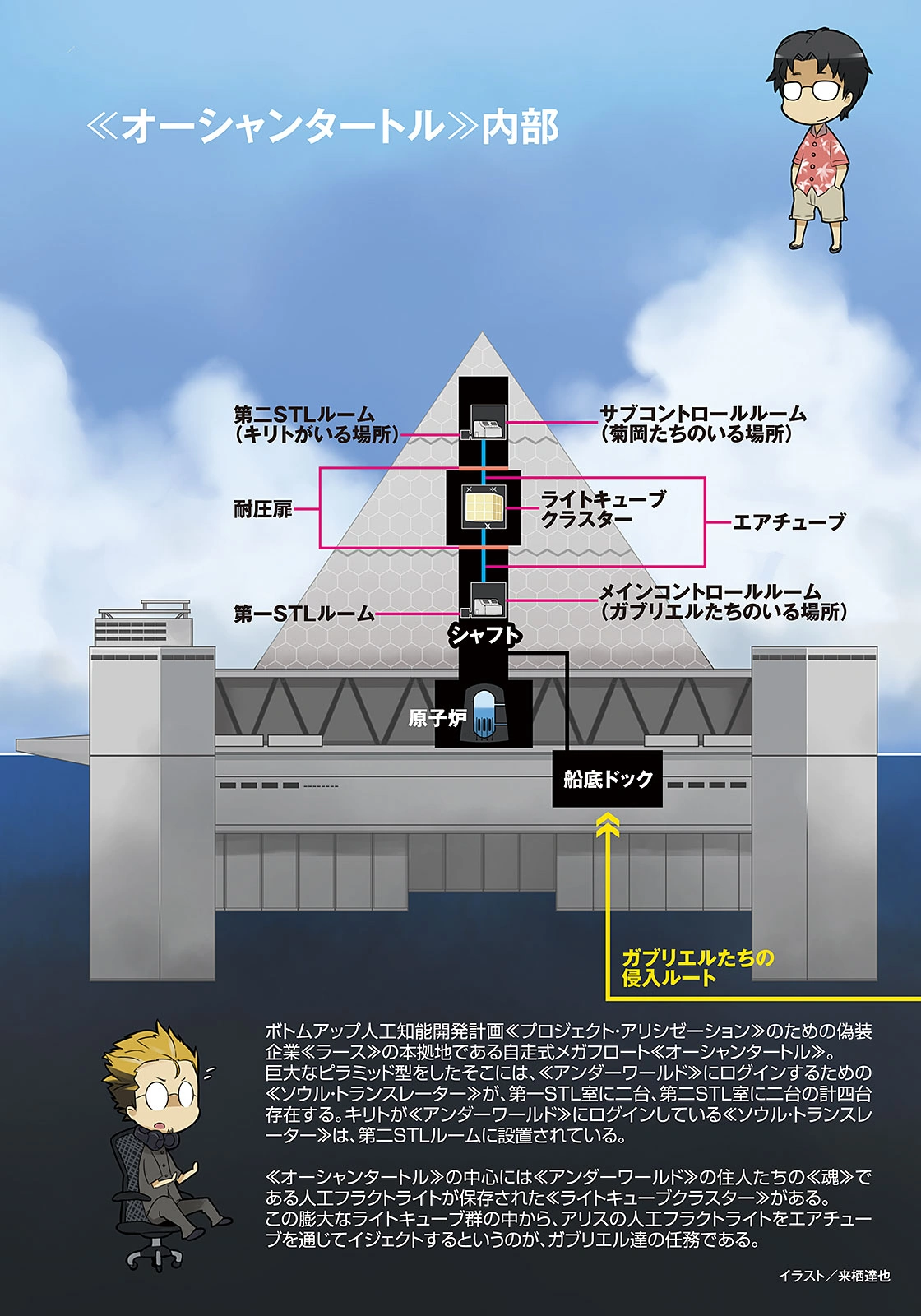 Funding for the facility was acquired from the government under the name of "Maritime exploration". Officially, it is supposed to be used as a facility for seabed oil extraction and research into AIs used for small submarines to navigate on their own,[2] but in reality, it houses four Soul Translators (STLs) that are used for Project Alicization to develop the first «bottom-up» AI, which Rath plans to use for military purposes of updating Japan's weapon technology.[1]